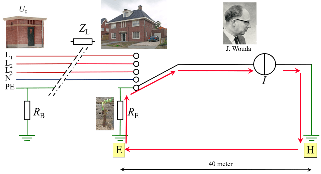 Bij het slaan van een aardelektrode wordt weerstand van de aardelektrode gemeten met een aardverspreidingsweerstandsmeter. Deze werkt volgens het “Systeem Wouda”, zie onderstaand schema.