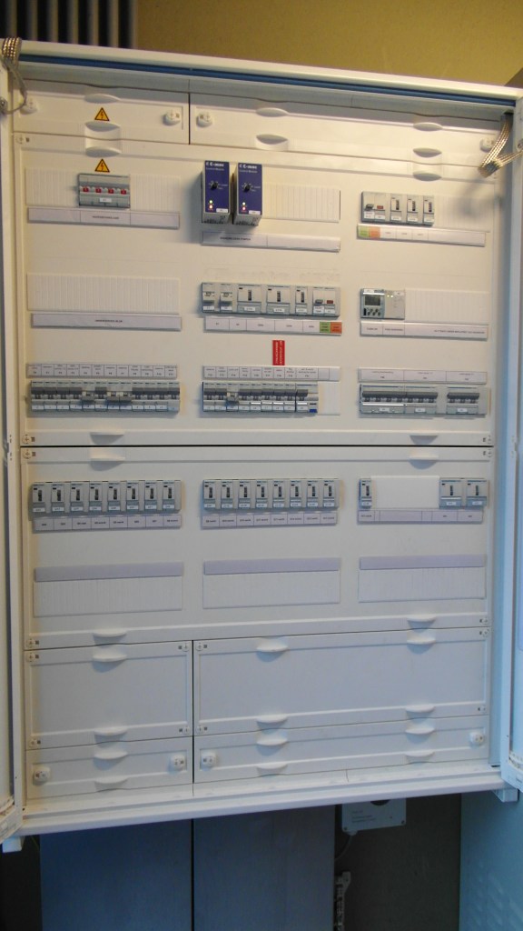 Boven het meterbord is een schakelkast geplaatst zonder beveiliging: alleen een vierpolige lastscheider van 40A. Deze is eigendom van de eigenaar van de elektrische installatie.