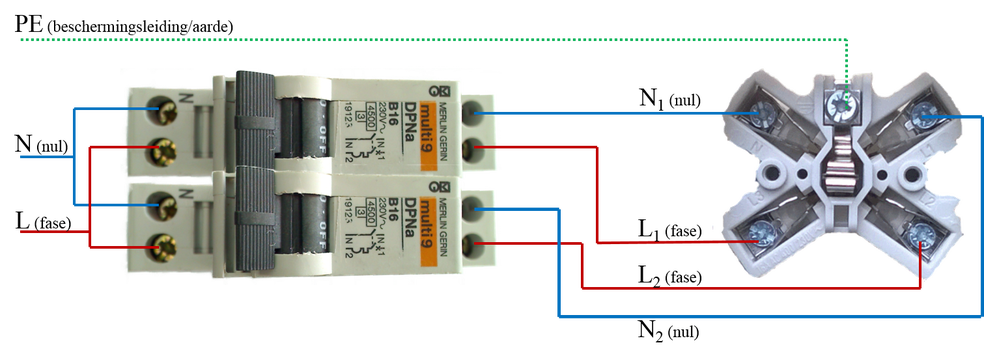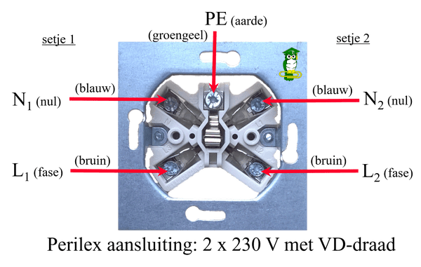Bij VD-draad in buis zijn beide fasedraden bruin en beide nuldraden blauw. Je moet deze setjes wel goed uit elkaar houden: de L1 en N1 behoren bij elkaar in de groepenkast te zijn aangesloten op de smeltpatroon met groepsschakelaar of installatieautomaat en de L2 en N2 vormen het andere setje dat ook bij elkaar wordt aangesloten.