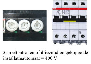 - als er 3 smeltpatronen zijn voor de kookgroep is er een driefasensysteem van 400 V. Dat geldt ook voor een (gekoppelde) drievoudige installatieautomaat.