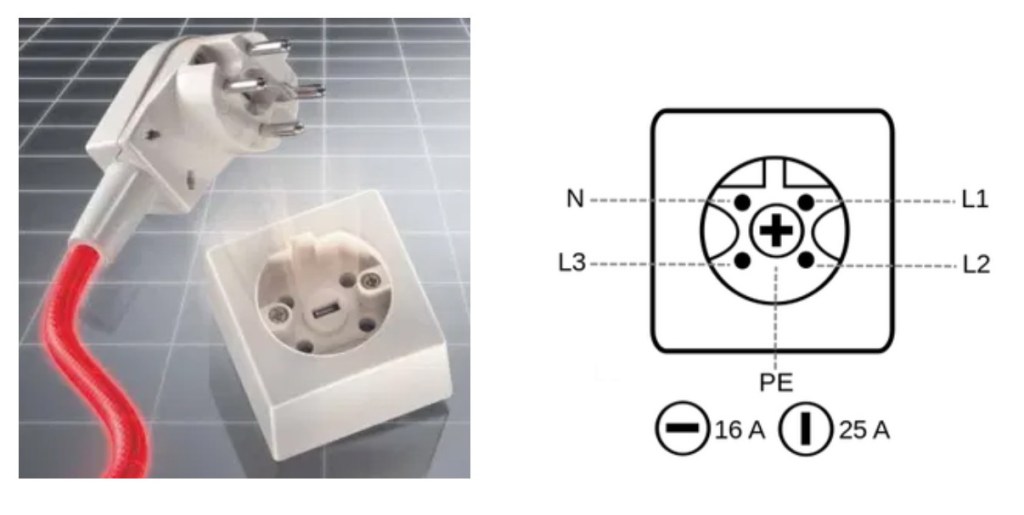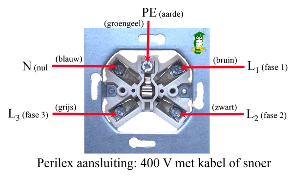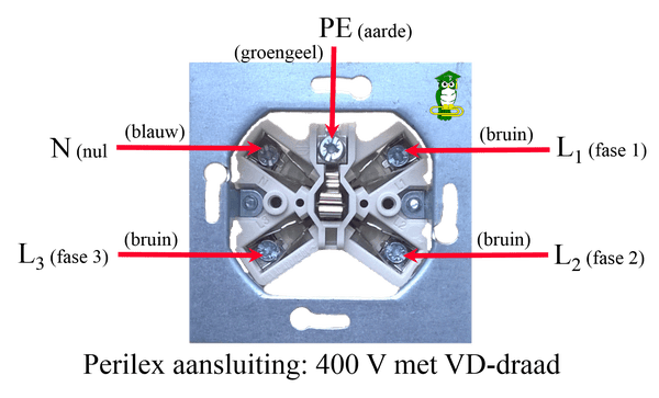 Driefasen aansluiting van een Perilex wandcontactdoos