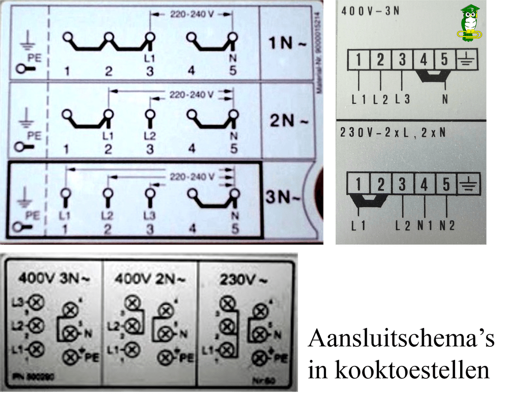 In het typeplaatje van het kooktoestel zijn 2 schema’s weergegeven: de middelste (400V) is voor een driefasen aansluiting (waarvan er 2 worden gebruikt). Het rechter schema (230V) is het schema wat we nodig hebben.