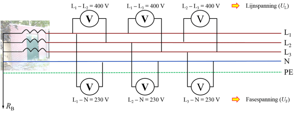 In bovenstaande afbeelding is een energietransformator afgebeeld. De transformator levert 3 fasen (L1, L2 en L3) en een nul (N). Ook is er een beschermingsleiding of aardaansluiting (PE). De spanningen tussen de fasen onderling is 400 V. De spanning tussen een willekeurige fase en de nul (of aarde) is 230 V.