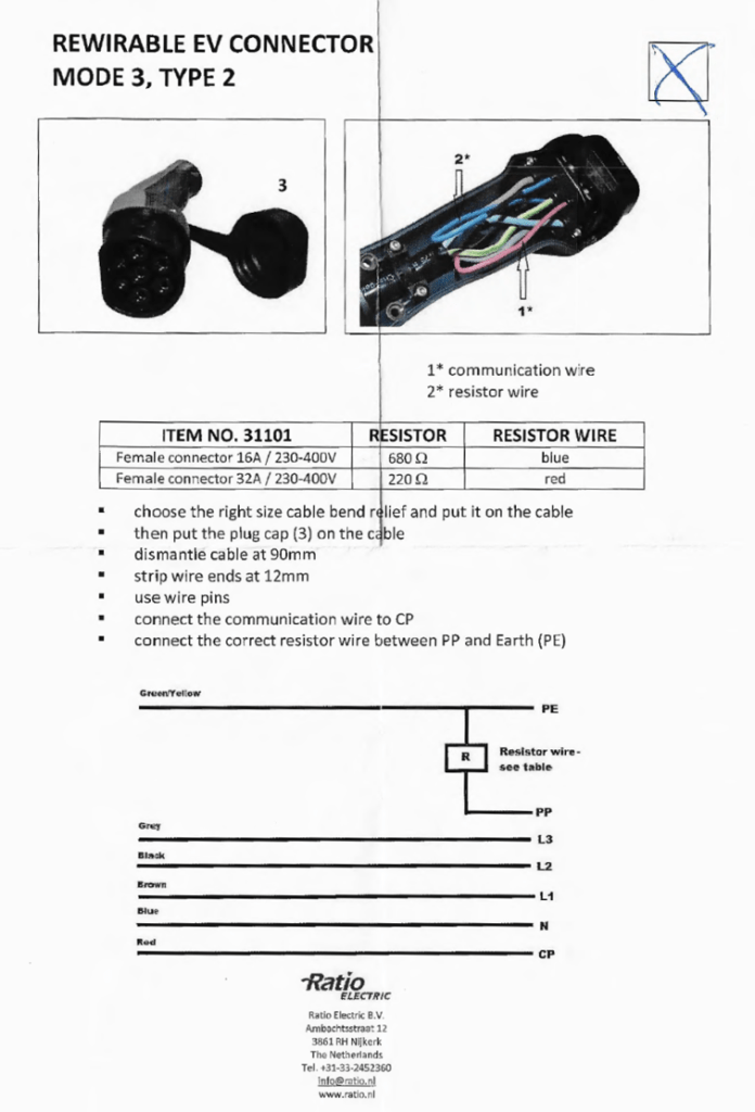 Als je al een laadstation type 1 hebt en je nieuwe auto heeft een stopcontact type 2 kan je ervoor kiezen om de stekker van type 1 te vervangen voor type 2. Het onderstaand voorbeeld is van de fabrikant Ratio.