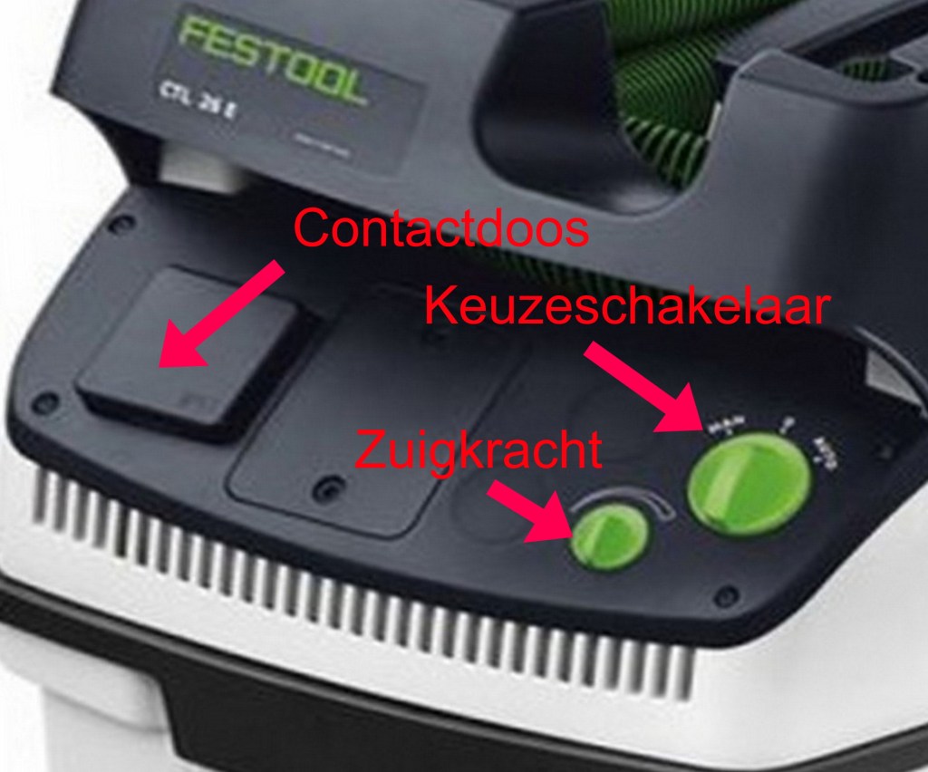 We nemen deze stofzuiger als voorbeeld. De stofzuiger heeft een contactdoos om ander gereedschap op aan te sluiten.